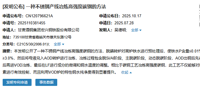 2025年10月17日,甘肃酒钢集团宏兴钢铁股份有限公司成功申请一项名为“一种不锈钢产线冶炼高强度碳钢的方法”专利,申请公布号为CN120796621A,申请日期为2025年7月28日。
